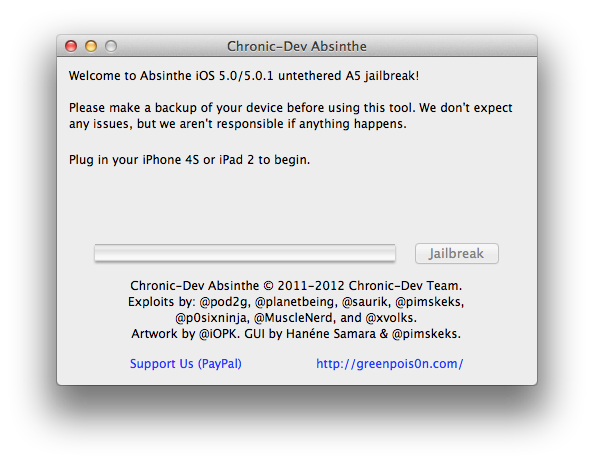 Známy hacker pod2g v spolupráci s niekoľkými ďalšími členmi jailbreak tímu Chronic Dev Team, vydali prvú iPhone 4S (iPad 2) jailbreak utilitu s názvom Absinthe a tá hneď po svojom vydaní lámala všetky doterajšie rekordy.