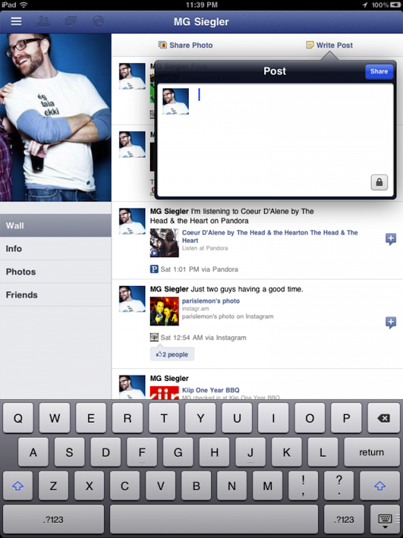 Podľa stránky Mashable, Facebook by mal predstaviť aktualizáciu svojej aplikácie pre iPhone, ktorá by mala byť kompatibilná aj s iPadom. Hovorí sa, že dôvodom, prečo iPad verzia aplikácie Facebook ešte nebola vydaná je spor medzi spoločnosťami Apple a Facebook. Aplikácia určená pre iPad bola vraj takmer hotová už v máji tohto roka.