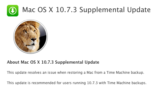 Apple pred malou chvíľou uvoľnil doplňujúcu aktualizáciu Mac OS X 10.7.3 Lion, ktorá rieši problém pri obnove systému zo zálohy, vytvorenej pomocou funkcie Time Machine. Apple túto aktualizáciou odporúča všetkým užívateľom, používajúcim spomínanú funkciu obnovy systému. Update o veľkosti 38 kB nájdete v sekcii Software Update v hlavnom menu systému alebo na oficiálnej stránke podpory spoločnosti Apple.