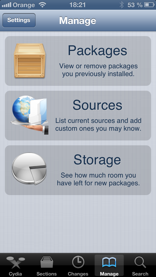 Akousi základňou Jailbreak úpravy je aplikácia Cydia, ktorej tvorcom je jeden z najznámejších Jailbreak vývojárov – Jay Freeman, známy tiež pod prezývkou Saurik. Pomocou Cydie je možné dostať sa ku všetkým spomínaným vylepšeniam. Pri prvom spustení je potrebné zvoliť si profil používateľa. Na výber sú tri možnosti: „User – Hacker – Developer„. Drvivá väčšina by si mala zvoliť profil „User“ – bežný používateľ. Používateľské prostredie Cydie sa do určitej miery podobá iOS aplikácii App Store, ktorú určite každý majiteľ jablčného zariadenia dôverne pozná. V spodnej časti sú znázornené základné sekcie: „Cydia – Sections – Changes – Manage – Search„. Začínajúci jailbreak používateľ si úplne vystačí s dvojicou Manage a Search. V sekcii Manage je okrem iného, možné v záložke „Storage“, skontrolovať si aktuálny stav úložného priestoru, alebo v záložke „Sources“, pridávať tzv. Zdroje (z angl. Sources/Repositories). Na začiatok si ale určite každý vystačí so základnou ponukou cydia utilít, takže žiadne zdroje/repos nie je potrebné pridávať, alebo čokoľvek v sekcii Manage „manažovať“. Pre začiatočníka bude najzaujímavejšou sekcia Search, pomocou ktorej si môže vyhľadať základné jailbreak aplikácie a utility.