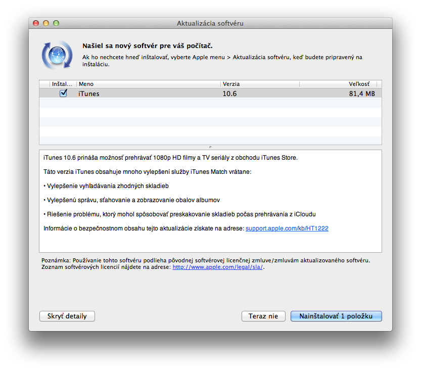 Len niekoľko hodín po predstavení novej generácie iPadu a Apple TV firma Apple vydala novú verziu aplikácie iTunes. Najhlavnejšou novinkou okrem opravy niekoľkých chýb ostáva samozrejme nová možnosť prehrávania Full HD 1080p obsahu z online obchodu iTunes Store. Nová verzia ponúka lepšie vyhľadávanie duplicitných skladieb, vylepšenú správu, sťahovania a zobrazovania obalov albumov a riešenie problému, ktorý mohol spôsobovať preskakovanie skladieb počas prehrávania z iCloud. iTunes 10.6 sťahujte prostredníctvom sekcie Software Update (Aktualizácia softvéru…) v hlavnom menu systému Mac OS X alebo z oficiálnej stránky Apple.