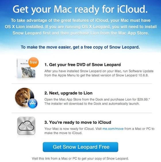 Apple dnes používateľom služby MobileMe so starším operačným systémom začal ponúkať možnosť získať bezplatnú licenciu operačného systému Mac OS X 10.6 Snow Leopard. Služba MobileMe sa totiž 30. júna 2012 stane minulosťou a k dispozícii bude už iba novovzniknutá služba iCloud. K plnohodnotnému využívaniu služby iCloud je však potrebné mať na svojom počítači nainštalovaný súčasný operačný systím OS X 10.7 Lion. K inštalácii OS X 10.7 Lion je potrebná licencia predchádzajúceho systému OS X 10.6 (pre bežných používateľov bez služby MobileMe stojí táto licencia 29 $). Apple chce týmto spôsobom používateľom služby MobileMe zjednodušiť prechod na OS X Lion so službou iCloud. Nebudú teda musieť pri prechode na OS X 10.7 Lion platiť dvakrát ale iba raz – pri prechode z (pre nich) bezplatnej licencie Mac OS X 10.6 Snow Leopard na OS X 10.7 Lion zaplatia 23,99 €.