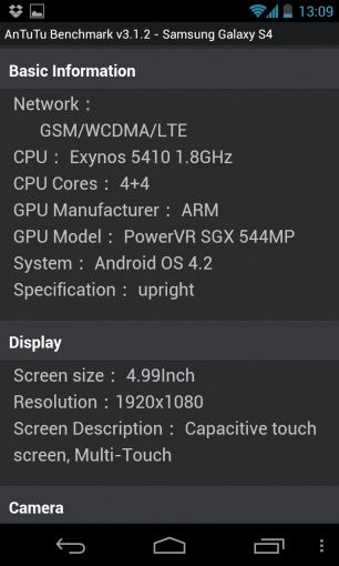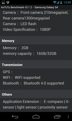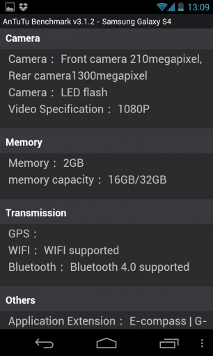 Počas uplynulého víkendu sa v benchmarku AnTuTu dokonca objavil záznam zariadenia, ktoré sa identifikovalo ako Galaxy S IV. Nový smartfón by mal podľa tohto záznamu ponúknuť špičku v oblasti mobilných technológií. Posúďte sami. Poháňať ho bude 8-jadrový procesor Exynos Octa 5410, ktorý bude kmitať na frekvencii 1,8 GHz. Operačná pamäť bude na úrovni 2 GB a o grafický výkon sa postará čip PowerVR SGX 544MP. Super AmoLED displej bude mať uhlopriečku 4,9-palcov a Full HD rozlíšenie 1920×1080 px. Na zadnej strane by mal byť umiestnený fotoaparát s rozlíšením 13 MPx. Testované zariadenie pracovalo pod operačným systém Android 4.2 Jelly Bean.