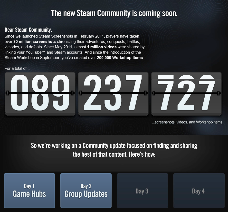Steam komunita podľa jej zakladateľov zažije v priebehu tohto týždňa najväčšiu zmenu od svojho spustenia v roku 2002. Od pondelka do štvrtka bude každý deň predstavená novinka v oblasti hráčskej komunity, ktorá by mala prispieť k lepšiemu zdieľaniu digitálneho obsahu, vytvoreného priamo používateľmi služby Steam. Od včera (pondelok) tak majú PC/Mac používatelia k dispozícii novinku v podobe služby Game Hubs. Tá umožňuje zdieľanie videí, screenshotov či módov jednotlivých hier na jednom mieste tak, aby k nim mali prístup aj ostatní hráči. To znamená, že ak vytvoríte screenshot, novú mapu, level či video, tento obsah môžte okamžite zdieľať na Game Hubs spoločne s ostatnými a tí si váš obsah budú môcť prezrieť, stiahnuť alebo nainštalovať. Keďže služba Steam Screenshots bola spustená vo februári 2011, v súčasnej dobe obsahuje Game Hubs viac ako 80 miliónov hráčskych fotografií, skoro 1 milión videí, 200 000 workshopov a ďalší hráčsky obsah.