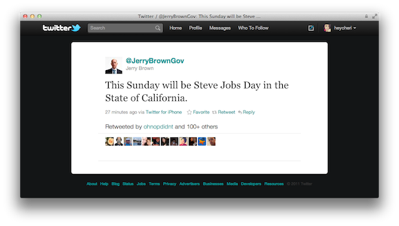 Na počesť pamiatky nedávno zosnulého Steva Jobsa, ktorý nás opustil 5.októbra 2011 sa v štáte Kalifornia rozhodli udeliť na 16.október deň štátneho sviatku. Podľa krátkej správy kalifornského guvernéra Jerryho Browna zverejnenej na sociálnej sieti Twitter, bude 16.október deň štátneho sviatku na počesť Steva Jobsa.
