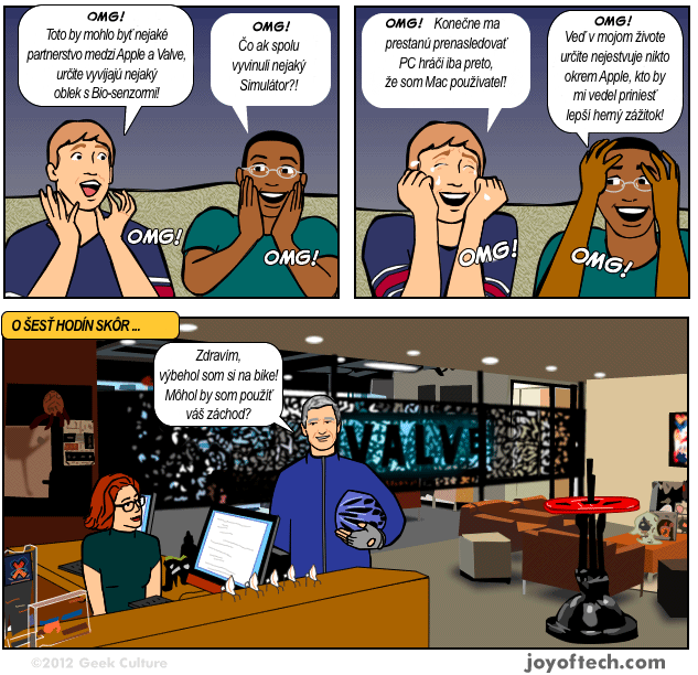 Dnes si ľudia v našej spoločnosti posielajú medzi sebou emaily typu: „S kým sa stretol Tim Cook? Stretol sa s tebou? Nie, so mnou sa nestretol.“ … ide o jednu z tých fám, ktoré boli prezentované tak veľmi objektívne a dôveryhodne, až sme z toho my sami ostali zmätení. Nikto z nás sa v spomínaný deň osobne nestretol s Timom Cookom ani s nikým zo spoločnosti Apple. Aj keď by sme určite chceli, pretože máme veľmi dlhý zoznam vecí, ktoré by mohla firma Apple realizovať, pre lepšiu podporu hier. Ale nie, nestretli sme sa s Timom Cookom. Vyzerá ako šikovní chlapík, no nikdy sme sa nestretli …