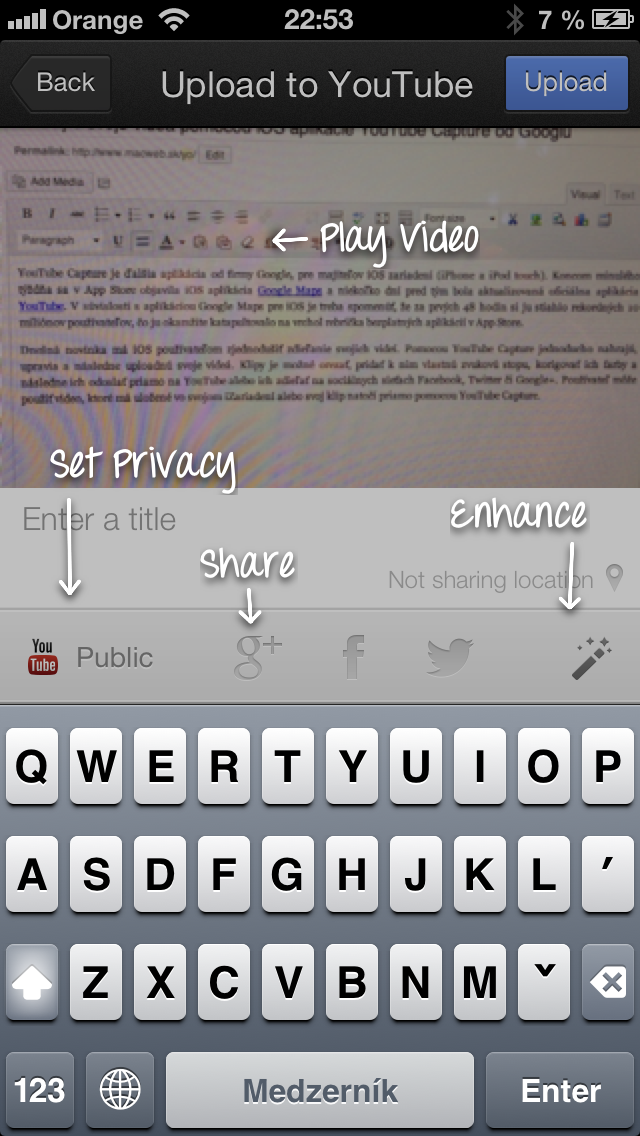 Dnešná novinka má iOS používateľom zjednodušiť zdieľanie svojich videí. Pomocou YouTube Capture jednoducho nahrajú, upravia a následne uploadnú svoje videá. Klipy je možné orezať, pridať k nim vlastnú zvukovú stopu, korigovať ich farby a následne ich odoslať priamo na YouTube alebo ich zdieľať na sociálnych sieťach Facebook, Twitter či Google+. Používateľ môže použiť video, ktoré má uložené vo svojom iZariadení alebo svoj klip natočí priamo pomocou YouTube Capture.